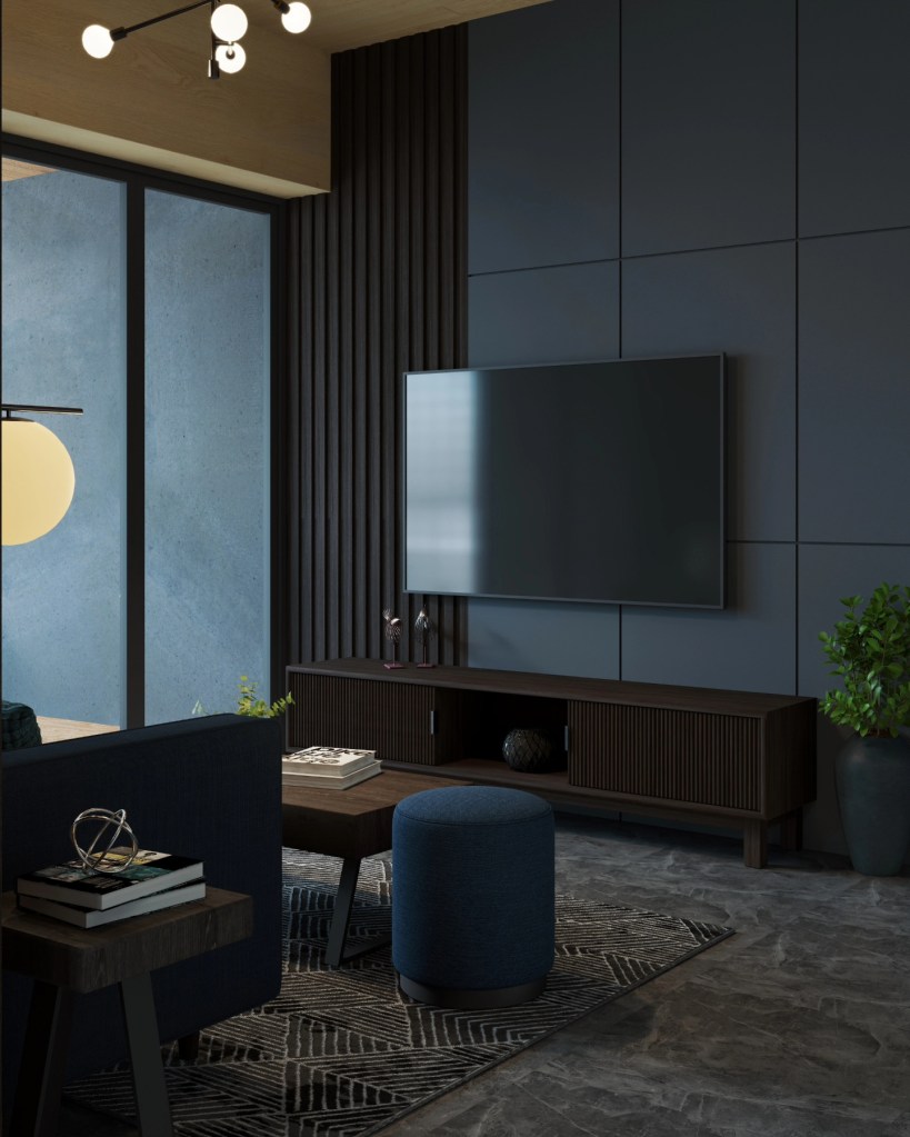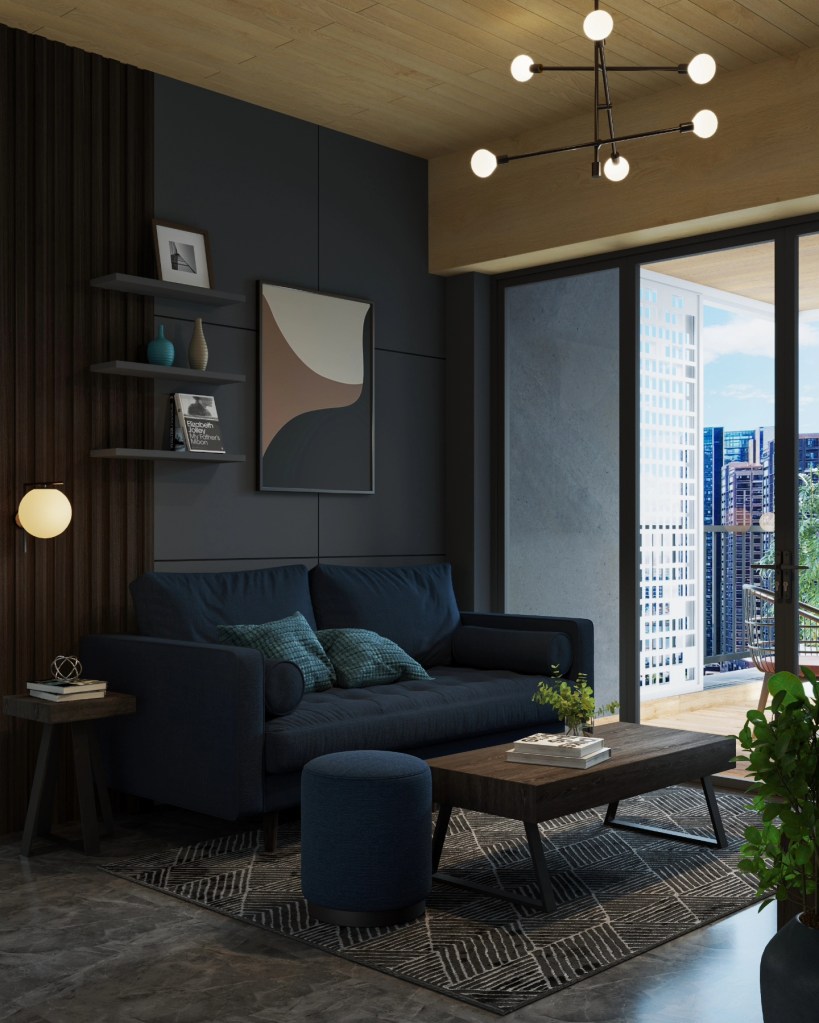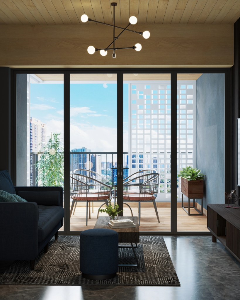One of the highlights of our design was the suggestion to incorporate a light veneer for the ceiling. This not only aligned with the mid-century modern ethos but also complemented the balcony tiles, creating a harmonious flow between indoor and outdoor spaces. The light veneer added a touch of brightness to the dark palette, ensuring the space felt open and inviting rather than closed off and somber.
